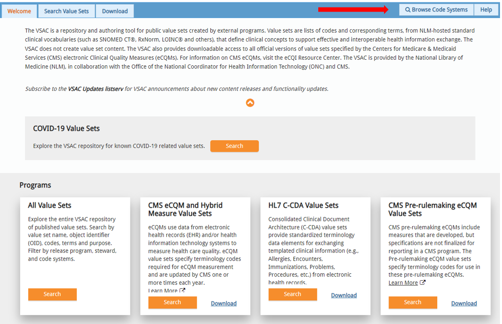 - Login into VSAC, and go to the Browse Code Systems button located at the upper right corner of the site by the Help button. You can also access Browse Code Systems by clicking on any hyperlinked terminology code within VSAC.